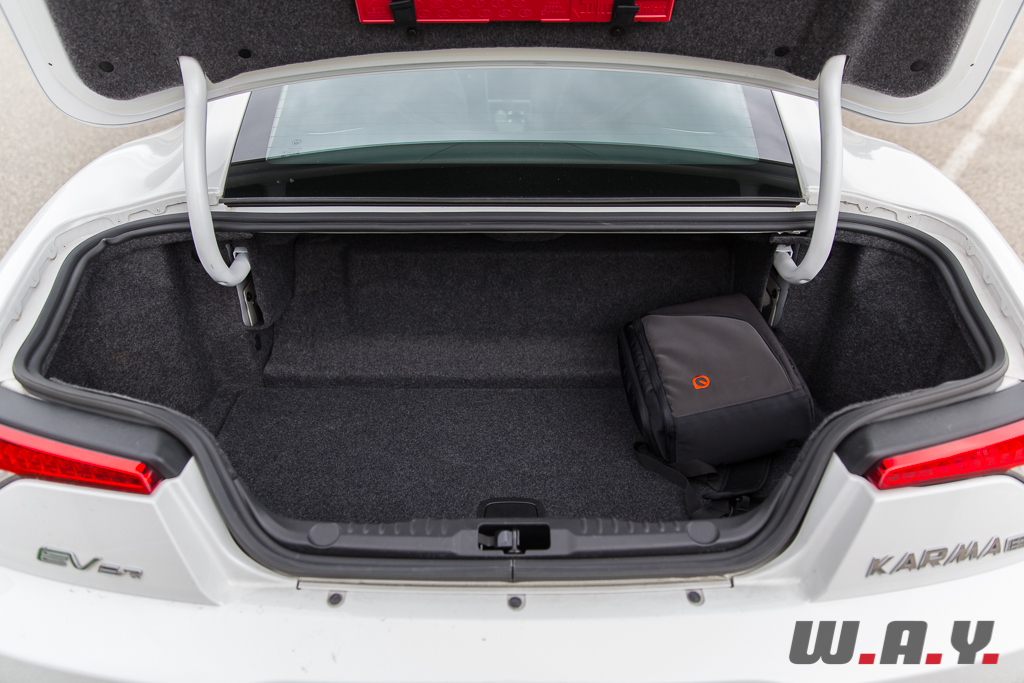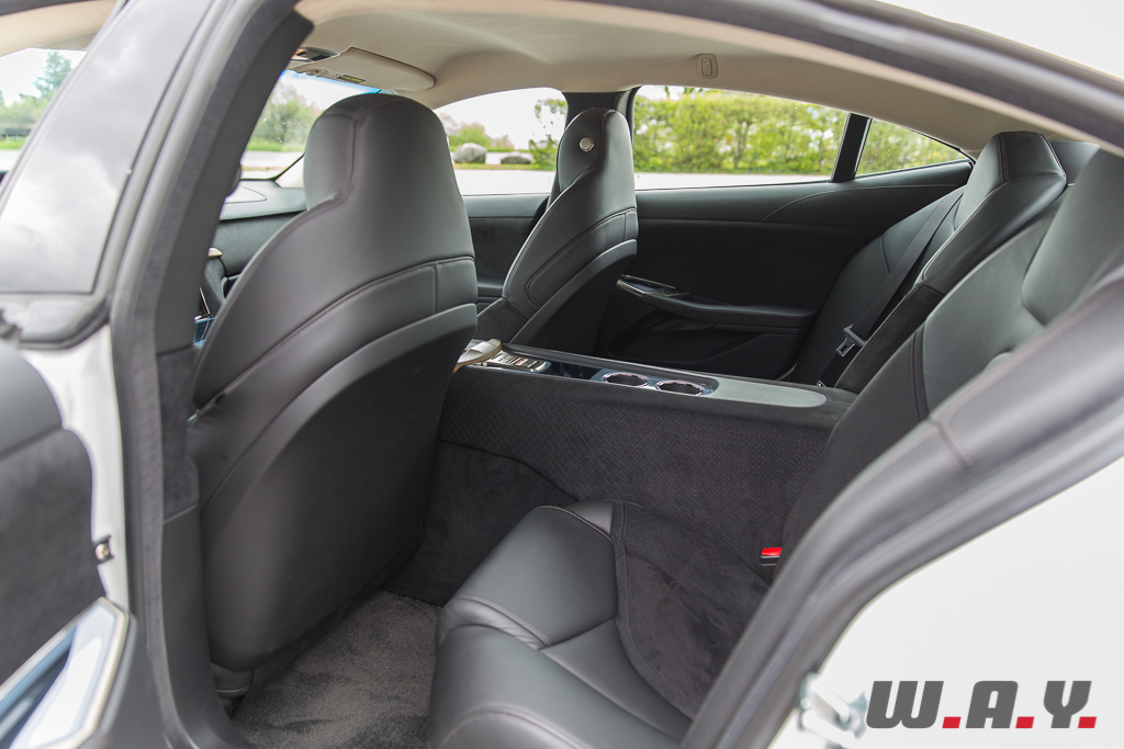 La qualité de finition est relativement bonne à l’exception de quelques éléments repris de l’industrie automobile américaine de masse, tels que les commandes de rétroviseurs électriques, les bouches d’aération et l’éclairage de plafonnier. Mais dans l’ensemble, c’est très bien fini et surtout la présentation est séduisante tout en restant sobre. L’ambiance cosy est très agréable, on se sent vraiment bien dans cette Fisker Karma. Les sièges sont très confortables, l’assise est bonne, vous avalerez les kilomètres en toute quiétude. Pour les passagers arrière la donne est un peu différente. Les deux sièges distincts acceptent sans problème des adultes mais à l’instar de l’Aston Martin Rapide, je ne m’aventurerais pas pour un long voyage avec deux occupants aux places arrière autres que des enfants, voire des adolescents.