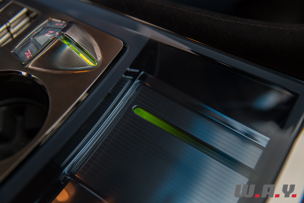 Revenons au poste de pilotage avec un volant à jante épaisse qui propose un dessin original forçant la prise en main à 10h10. Une bonne chose me direz-vous, mais à l’utilisation, je me suis souvent retrouvé à chercher une bonne position pour mes mains. Un moindre détail car après une semaine aux commandes de ce vaisseau, euh de cette voiture, je m’y suis habitué. Les compteurs sont cerclés d’aluminium brut du plus bel effet, matériau qu’on retrouve aussi dans la console centrale en plus du verre. D’ailleurs sous une vitre, un élément métallique représente de manière conceptuelle la présence des batteries en tant que cœur de la voiture. Ce dernier est traversé par une bande lumineuse qui s’allume en vert lorsqu’on actionne le sélecteur de vitesses. Aucune utilité à cela, juste de quoi renforcer le sentiment d’être à bord d’un véhicule différent. D’ailleurs le levier de vitesses, qui n’en est pas un, prend la forme d’un petit dôme ou d’un diamant selon votre vision des choses. Sur ce dernier, nous retrouvons quatre boutons qui eux sont plutôt habituels sur une transmission automatique, « D », « N », « R » et « P ». Vous l’aurez compris, à l’exception de la présentation visuelle, le principe reste le même, pas d’inquiétude à avoir.