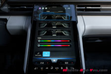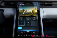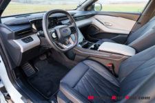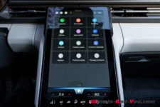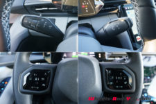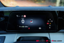 Par certains aspects, l’intérieur rappelle un peu celui du VW ID.4 : un petit écran trapézoïdal derrière le volant (5.4″), un plus grand écran au milieu de la console centrale (14.6″), une commande de transmission rotative derrière le volant côté droit. Le panneau de commande des phares, situé à gauche du volant, est même identique en tout point.