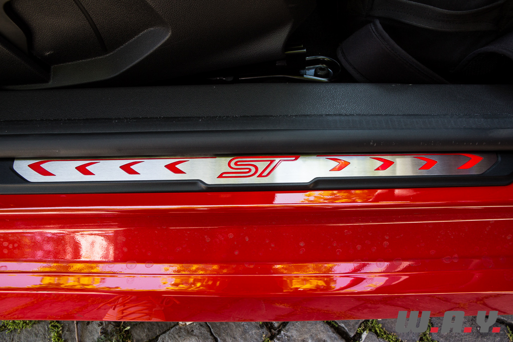 Les seuils de porte, badgés d’un « ST » illuminé en rouge, sont du plus bel effet (Pack Performance I, CHF 220.-), pour autant que vous ayez moins de 40 ans. Pour le reste, mis à part le bleu de la commande de climatisation (manuelle), c’est noir et rouge… mais surtout noir. Quant à la qualité des plastiques, pas de surprise : c’est perfectible au niveau tableau de bord et contre-portes, mais n’oublions pas que nous sommes à bord d’une sportive tarifée raisonnablement, pas dans une citadine « premium ». Une bonne note pour le levier de vitesses agréable à regarder comme à manœuvrer ainsi que pour le levier de frein à main avec un mélange de cuir et d’imitation aluminimum pour le manche.