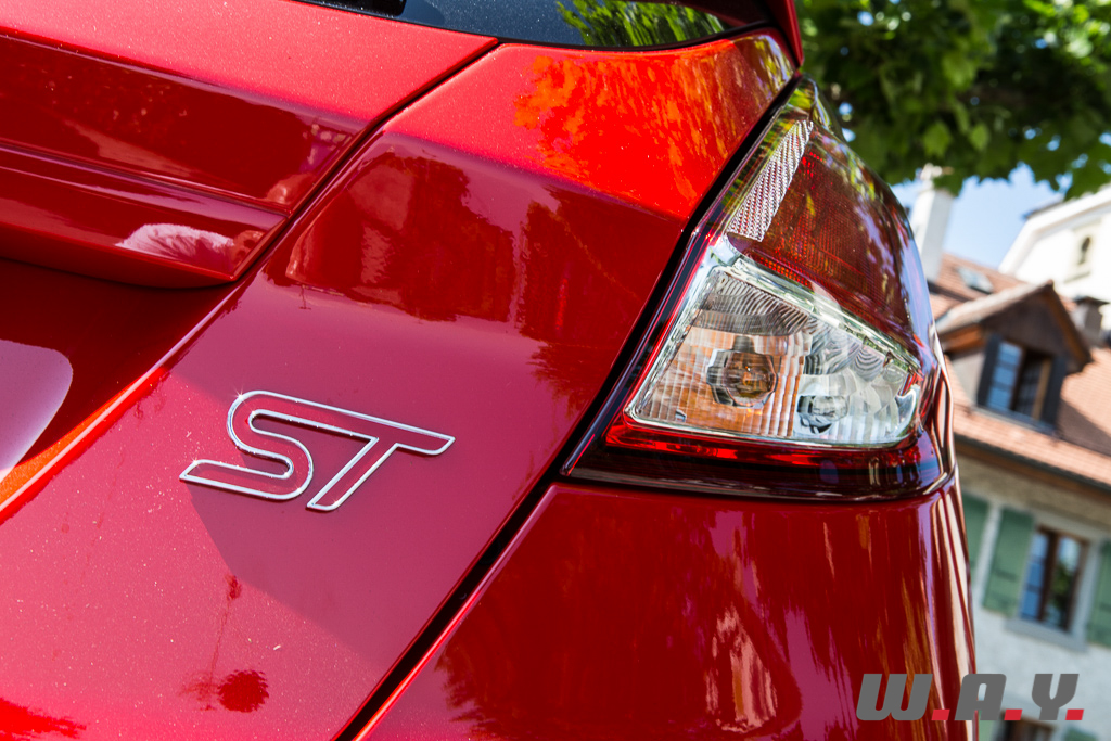 Ford a évité, à mon grand bonheur, les ajouts déplacés et hideux qui « font sport », pour travailler à fond et avec parcimonie les lignes des portières, des bas de caisses et des passages de roues pour rappeler le monde de la course tout en restant homogène. Petit bémol personnel pour les logos ST que l’on retrouve un peu partout (avant, arrière, moteur..) mais le reste est le fruit de beaucoup de bon goût. J’imagine la ST encore plus épurée en Panther Black voire en Performance Blue, comme une certaine Escort à une époque pas si lointaine que cela finalement.