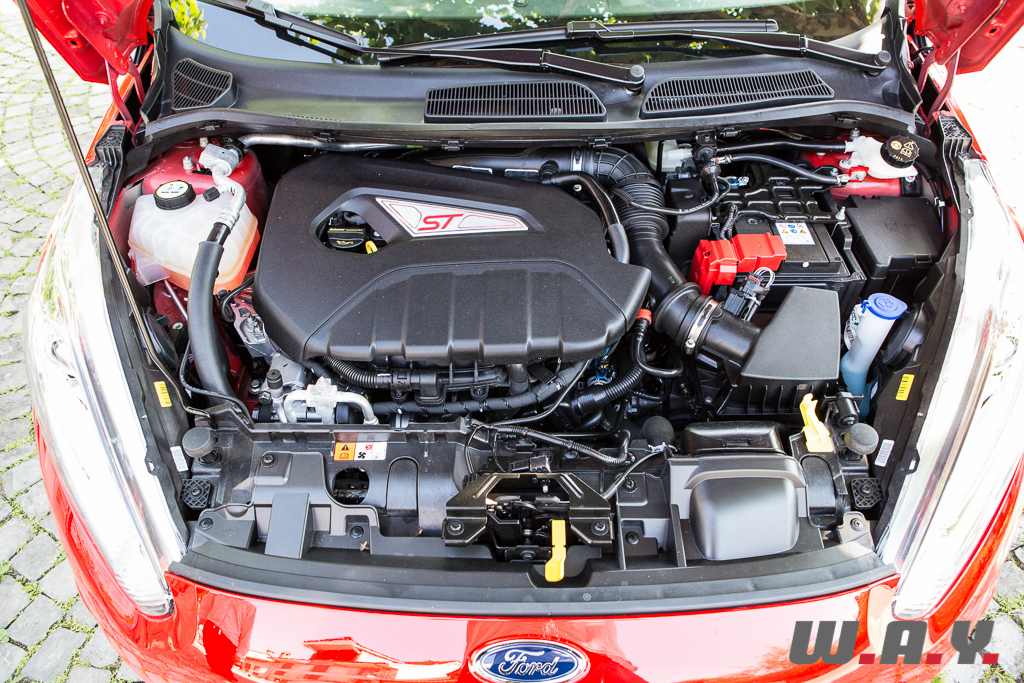 Si la Fiesta de base a l’air un peu pataude à l’avant, la ST s’en tire beaucoup mieux : les longs phares enveloppant les ailes avant jusqu’au milieu des passages de roue sont du plus bel effet et sa calandre vous donne une idée du volume d’air nécessaire pour gaver ce quatre cylindres – disons le tout de suite – « hyperdoué ».