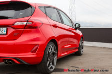 Becquet de toit, double sortie d’échappement et surtout des très belles jantes 18 pouces (série pour ST3, option pour ST2) au style original, mais aussi une carrosserie légèrement bodybuildée, voici en résumé de quoi se compose l’esthétique de notre bouillonnante Fiesta.