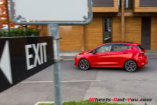 Parfaitement assis aux commandes de cette Fiesta ST, je la découvre gentiment et je constate assez rapidement l’excellent feeling de la direction. Un atout qui se perd de plus en plus de nos jours, même sur les sportives. La volant bien en mains, la direction est précise et plutôt directe. Quel plaisir, j’adore !