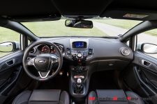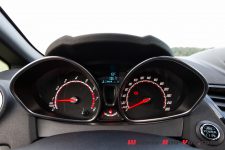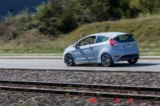 Je découvre tranquillement ma voiture d’essai. Je constate d’emblée la fermeté des suspensions, limite inconfortables, mais qui promettent une tenue de route à l’avenant lorsqu’il sera temps d’accélérer le rythme. Et cela ne tarde pas quand je réponds à l’irrésistible appel des routes de col de notre beau pays. Me voilà donc menant notre Fiesta sur de sinueux rubans de bitume où sa stabilité est remarquable. La prise de roulis quasi-nulle, le comportement royal, sans doute aidé par les améliorations du châssis comprenant une barre anti-roulis plus épaisse à l’avant et, à l’arrière, une barre de torsion à la rigidité accrue, ainsi qu’un centre de gravité abaissé de 15 mm et des suspensions raffermies. Cela se ressent dans les enchaînements rapides comme dans les courbes en appuis. Même menée avec vigueur, jamais la Fiesta n’est prise en défaut.