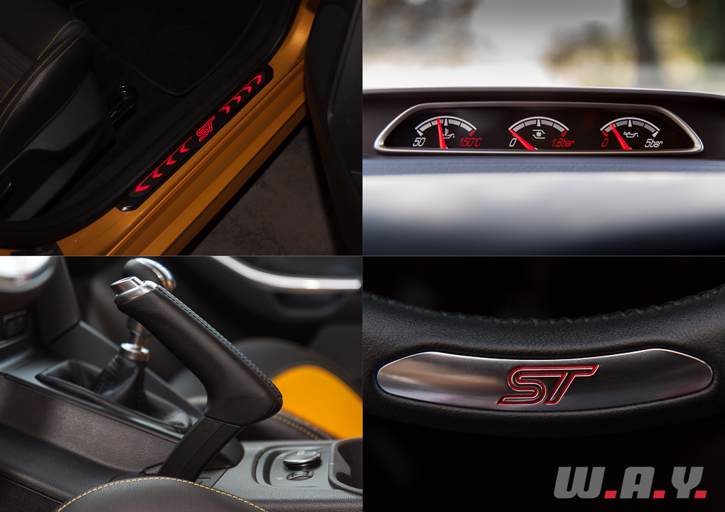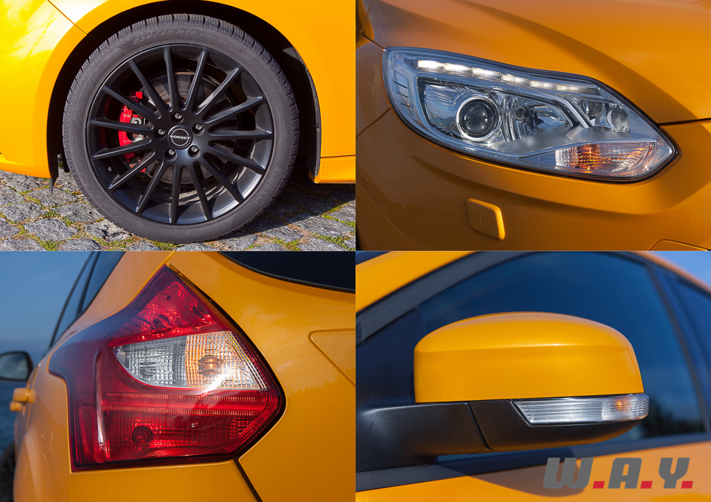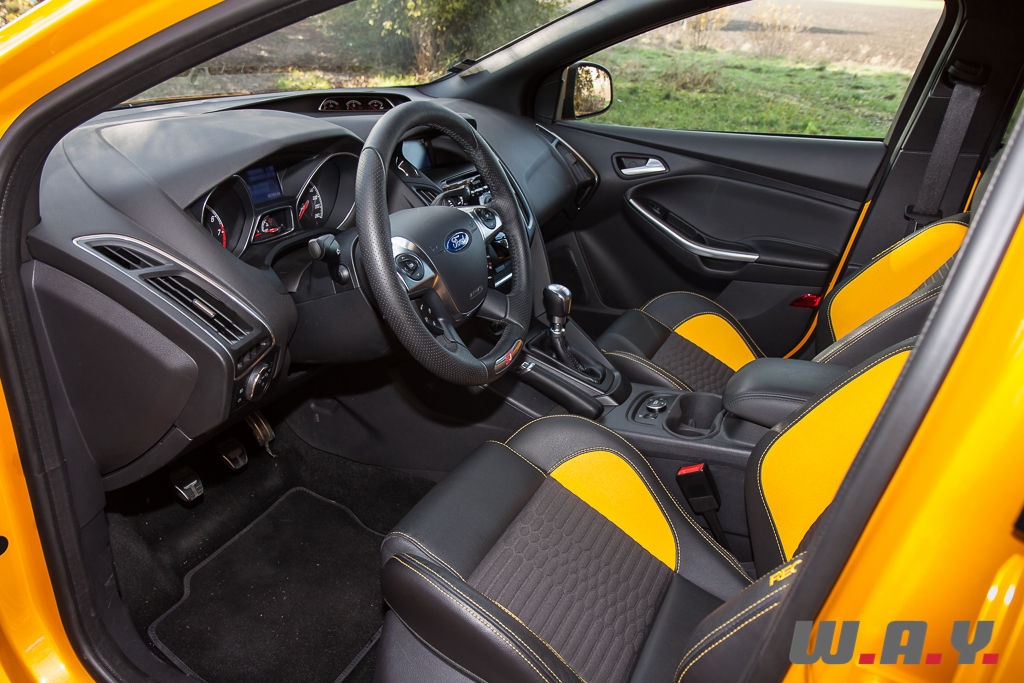 La nouvelle Focus ST abandonne la configuration trois portes de son aïeule, opte pour cinq portes bien pratiques et est même disponible en break. Pour se différencier du reste de la gamme, la ST s’affuble d’une imposante grille avant en nid d’abeilles, un spoiler arrière, un échappement central à la forme originale, des jantes de 18’’ (bien que notre modèle est équipé d’une monte hivernale) et quelques appendices sportifs comme les bas de caisse proéminents, les pare-chocs enveloppants ou les passages de roues accentués. Les imposantes optiques s’intègrent parfaitement à l’ensemble, suggérant l’agressivité à l’avant et soulignant le dynamisme de l’auto à l’arrière. C’est à mon sens une vraie réussite, un savant mélange entre sportivité et originalité, intégrant parfaitement le style « Kinetic Design » cher à la marque et faisant le lien avec le reste de la gamme du constructeur, tout en gardant une ligne générale homogène ne versant point dans le tuning vulgaire malgré un coloris tape-à-l’oeil.