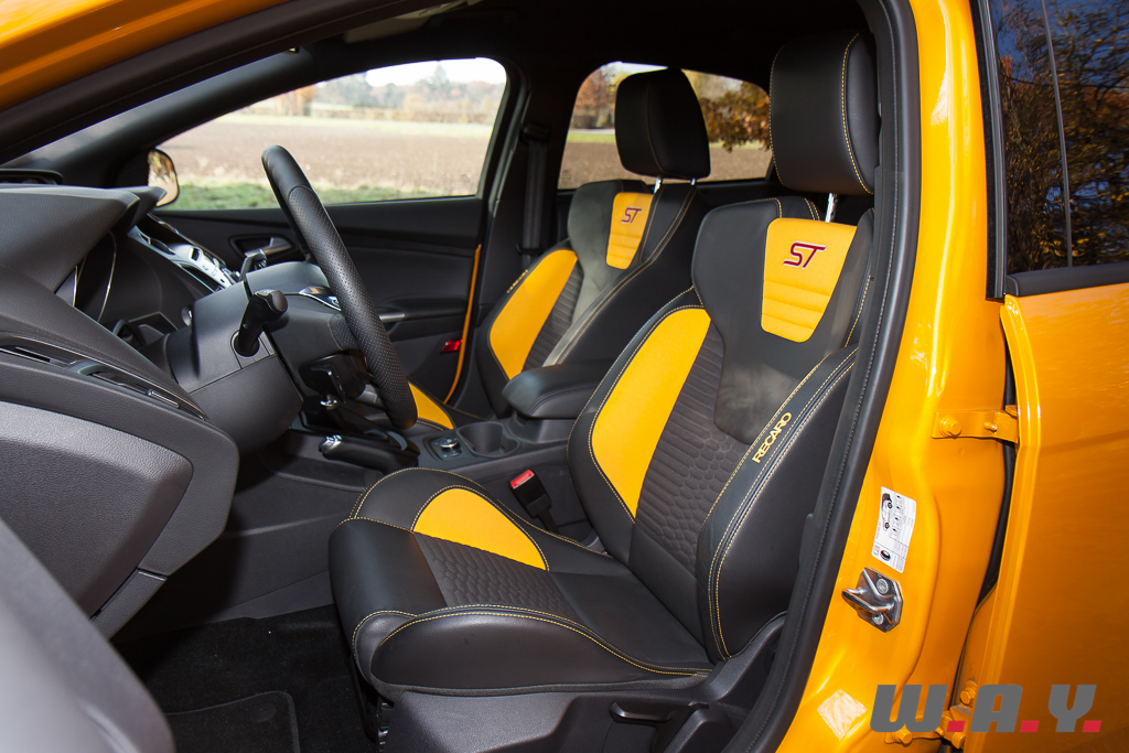 La Focus ST est disponible en trois niveaux de finitions (ST-1, ST-2 et ST-3) qui se différentient principalement par quelques éléments de confort supplémentaires au fur et à mesure que l’on monte en gamme, comme par exemple le cuir, les feux au xénon, les sièges chauffants et aux réglages électriques, etc. Dès le premier niveau la dotation de série est plutôt complète, comprenant les magnifiques sièges sport Recaro au confort et maintien remarquables et souvent facturés au prix fort chez les concurrents. Pour le GPS ou la hifi Sony, il faudra par contre puiser dans le catalogue d’options.