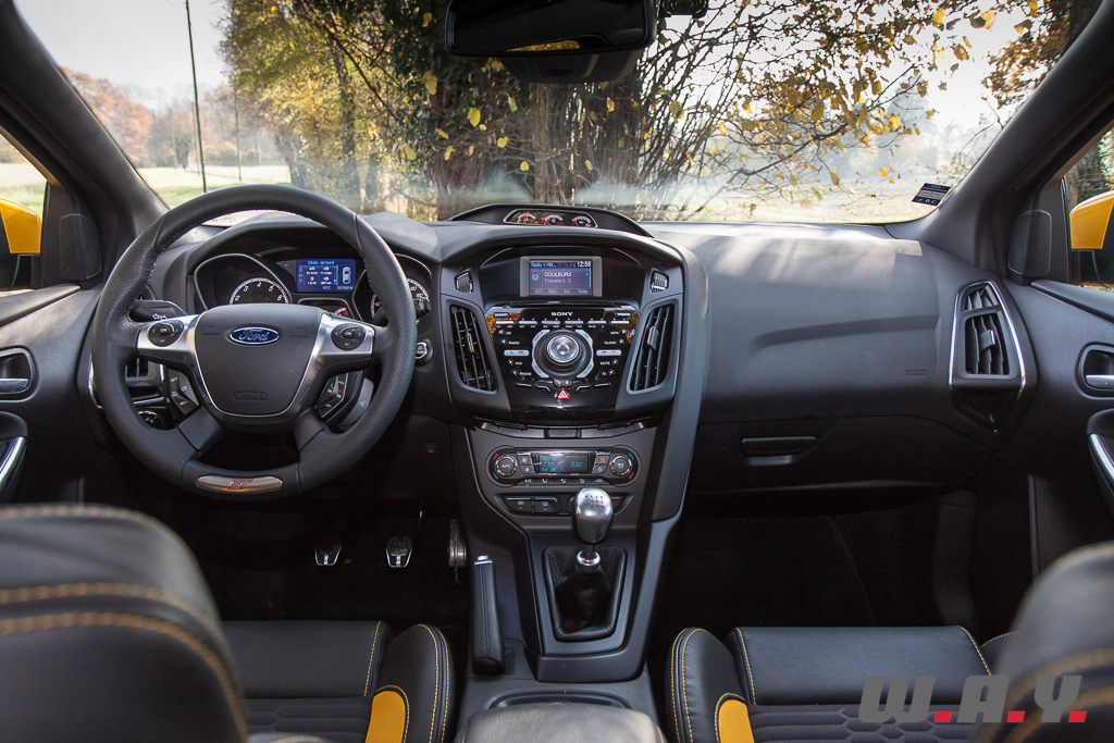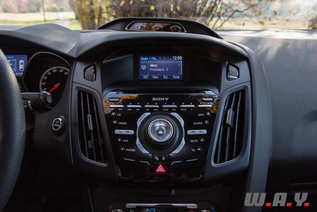 Le « Kinetic Design » s’interprète également dans l’habitacle. Si au premier abord l’ensemble peut paraître torturé et mastoc, on s’en accommode très facilement et l’ergonomie a été particulièrement bien étudiée pour les commandes de base. J’en veux pour preuve la facilité de navigation à l’intérieur des menus de l’ordinateur de bord ou le pairage en dix secondes chrono en main de votre téléphone portable avec l’interface Bluetooth. Les réglages de l’autoradio quant à eux nécessitent d’être étudiés attentivement pour ne point se perdre dans la forêt de boutons. L’instrumentation est complète et claire à la lecture. Coiffant le sommet de la console centrale, nous retrouvons les trois petits manomètres (température d’huile, pression du turbo et pression d’huile) qui signaient déjà les versions ST et RS de la mouture précédente de la Focus.