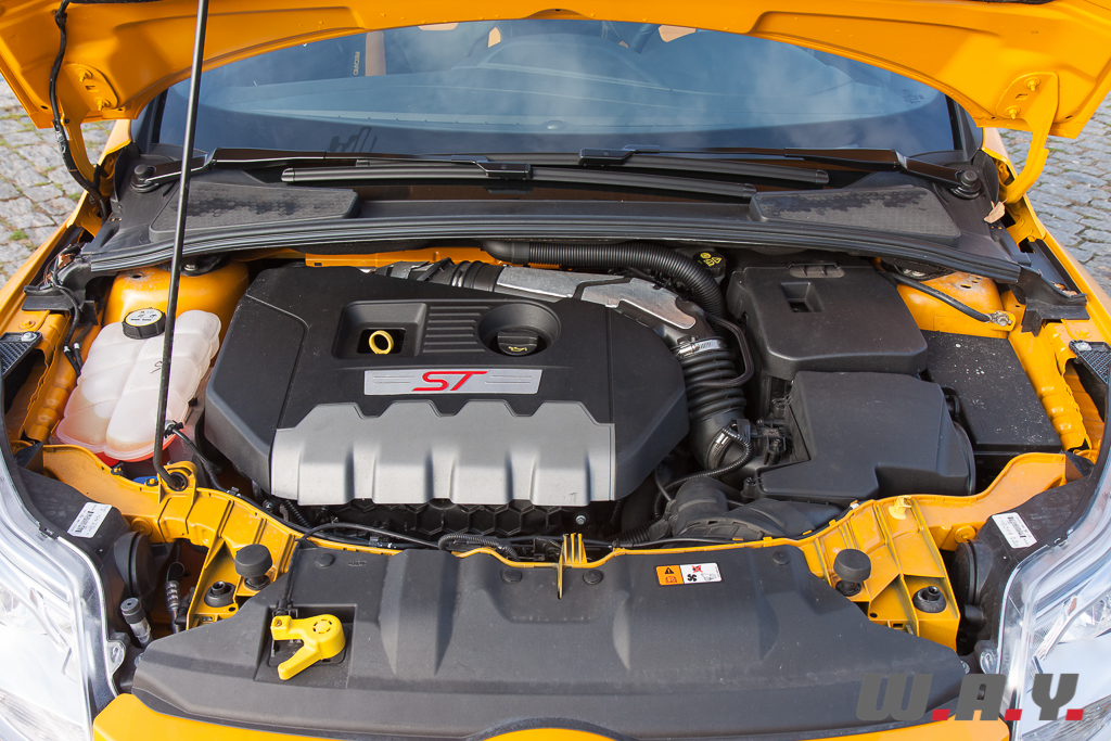 Bye bye le mélodieux cinq cylindres d’origine Volvo de l’ancienne Focus ST. La petite dernière a elle aussi succombé aux sirènes du downsizing et opte pour un quatre cylindres turbocompressé « Ecoboost » de 1’999 cm3 de cylindrée. Il développe 250 CV à 5’500 t/min pour un couple maxi de 360 Nm disponible entre 2’000 et 4’500 t/min. Le rendement est plutôt intéressant avec une puissance spécifique de 125 CV/litre. Le 0 à 100 km/h est abattu en 6.5 secondes et la vitesse de pointe culmine à 248 km/h. Souple, répondant avec vigueur dès les bas régimes et merveilleusement assisté par la boîte de vitesses manuelle à six rapports qui en extrait la quintessence, ce moteur est particulièrement plaisant à l’utilisation. Il manque cependant un tantinet d’allonge et j’aurais préféré pouvoir tirer encore quelques centaines de t/min au-delà de 5’500-6’000 t/min, régime à partir duquel le quatre pattes commence à s’essouffler. Oui, bon ce n’est pas non plus tous les jours que l’on « tire » aussi haut dans les tours, je vous l’accorde. Mais quand on me dit « sport », je conduis « sport », surtout lorsque les quatre premiers rapports de la boîte de vitesses sont courts et incitent à l’arsouille…