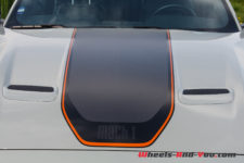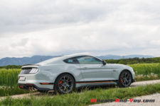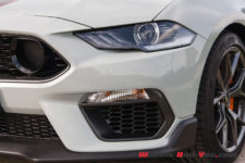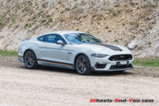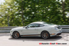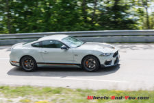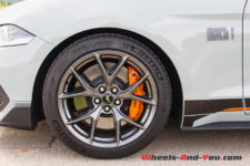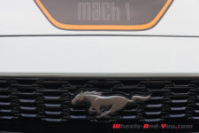Le long capot de couleur « Fighter Jet Grey », comme le reste de la voiture, possède deux petites entrées d’air avec, en son centre, une large bande noire avec liséré orange sur lequel est sobrement écrit, en bout de capot, « Mach 1». Les ailes avant sont badgées de l’écusson « Mach 1 » classique. De profil, la silhouette est trapue et sportive avec un aileron et des jantes à cinq branches de 19 pouces garnies de larges freins Brembo.