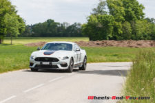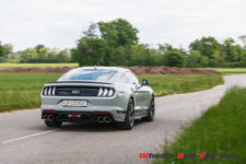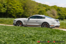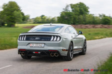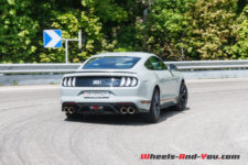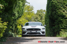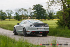 Quel que soit le mode choisit, côté châssis, on sent le poids de cette Mustang GT. Les ingénieurs Ford Performance ont bien travaillé la suspension avec l’apport de pièces reprises aux Mustang Shelby GT350 et GT500 (ressorts et barre antiroulis avant plus rigides, silent-blocs rigidifiés barre anti-rapprochement). De plus, la technologie adaptative des amortisseurs MagneRide à variation magnétique, apporte plus de rigidité et de réactivité selon les modes sélectionnés. Même avec la suspension réglée au plus souple en mode « Normal», la Mach 1 reste ferme, mais jamais inconfortable. Cela permet de rouler assez vite sur nos petites routes imparfaitement planes. La Mach 1 absorbe presque tout, mais cela n’empêche pas, sur mauvais revêtement, à ce train avant, de par sa monte pneumatique généreuse et sa géométrie, de chercher sa route. J’aime bien. Il faut la tenir cette Mustang. Elle vous implique et impose une certaine poigne si vous ne voulez pas être dépassé. C’est viril.