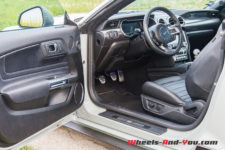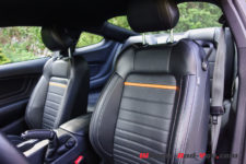 Les surtapis avant sont hyper épais, dignes d’une limousine cossue. Les siège en cuir vous accueillent à « l’américaine » et pourraient être plus enveloppants, mais là encore on pardonne car c’est une Mustang avec son mode de vie à elle. A noter que des Recaro aux formes plus sportives sont disponibles en option sans différence de prix, mais qui ne sont pas climatisés.