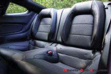 En m’installant à bord, je constate que c’est peu coloré et même un brin austère pour une sportive qui, à l’extérieur, n’hésite pas à affirmer sa personnalité. Heureusement qu’avec cette Mustang d’autres sens se mettent en éveil et que l’on regardera davantage la route que l’habitacle. Les places arrière seraient confortables s’il y avait suffisamment d’espace pour les jambes. En fait, seuls des enfants y seront bien.