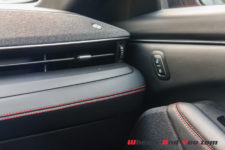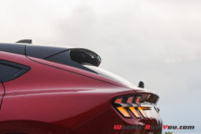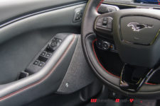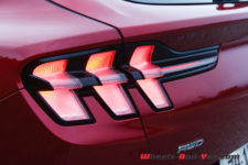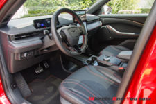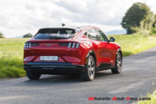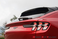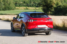 Le profil arrière arrondi et musculeux avec ses ailes bien galbées est souligné par des passages de roues noires laquées brillants, teinte que l’on retrouve sur les rétroviseurs et les parties qui entourent le toit en verre. A l’arrière, on retrouve le design des phares très « Mustangien ». Tout l’ensemble est bien proportionné et interpelle. Trop Mazda pour certains, peut-être par cette couleur Lucid Red, trop Hyndai Santa Fe pour d’autres, et pourtant il a sa propre identité et les gênes Mustang sont bien là. Le design est simplement remis au goût du jour.