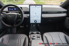 Par ailleurs, avec un diamètre de braquage de 11,6 m, donc relativement court pour un tel véhicule, surtout avec cet empattement, la conduite en ville n’est pas un problème. Côté vie pratique, lors de longs parcours, le système SYNC 4 affiche les emplacements de bornes de recharge, leur disponibilité et leurs tarifs. Le tout en temps réel. Ford introduit la fonctionnalité « Intelligent Range » qui va calculer l’autonomie restante du véhicule selon la circulation, les routes et les conditions météorologiques du moment. Si le rayon d’action baisse pour différentes raisons liées à des facteurs aggravants, alors l’utilisateur recevra une notification. Petit détail, j’ai tendance à oublier de couper le contact à chaque sortie du véhicule comme, par exemple, pour aller ouvrir le portail, qui lui n’est toujours pas électrifié… Et à chaque fois j’ai droit à un double coup de klaxon pour me rappeler que j’ai la clé dans ma poche et surtout que j’ai laissé le contact.