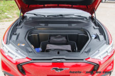 Surprise ! Sous le capot on trouve des rangements pour accessoires et autres. Les deux moteurs électriques synchrones à aimants permanents « Type 351 » sont positionnés chacun sur un train roulant. L’ensemble cumule une puissance de 258 kW (351 ch) et surtout 580 Nm de couple disponible instantanément. L’autonomie homologuée à 540 km en cycle mixte WLTP ne sera jamais atteinte, ni approchée, lors de notre essai qui, je dois vous l’avouer, n’est à aucun moment réalisé en mode économique.
