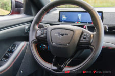 La Mustang Mach-E avec le système SYNC 4 offre une configuration bien supérieure à ce qui existait chez Ford jusqu’à présent, le retard semble enfin comblé. En effet, il ne suffit que de deux clics maximum pour accéder à n’importe quelle application, information ou réglage, assure Husein Dakroub, en charge du développement de ce système infotainement. Une fois activée, la fonction « Phone-as-a-Key » déverouille les portes du véhicule dès que l’utilisateur s’en approche et enclenche les préférences et réglages individuels du conducteur. En cas de batterie de téléphone à plat, l’utilisateur entre son code personnel via un clavier virtuel situé sur la portière avant conducteur. Une commande rotative située en bas du grand écran sert à régler le volume sonore du système audio B&O avec, en son centre, la possibilité de l’éteindre. Ce dernier, comme d’habitude avec cette marque, offre une qualité d’écoute remarquable sans jamais saturer, même avec le volume réglé à son maximum.