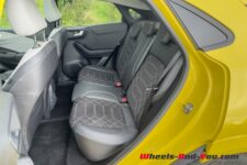 Comme dans le Puma thermique, les places arrière déçoivent. Le plancher est remonté d’environ 3 cm par l’inclusion de la batterie. Les adultes voient leurs genoux remonter trop haut et leurs cuisses survolent les assises. La banquette arrière fait donc l’affaire pour les enfants, moins pour des grands.