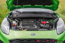Pour animer ce Puma ST, on retrouve le moteur, entièrement en aluminium, 3 cylindres 1.5 EcoBoost de 200 ch à 6’000 t/min qui équipe la Fiesta ST. Il s’adjoint un turbo radial-axial comme suralimentation, sustenté par une injection haute pression. Il possède un réglage indépendant du calage des deux arbres à cames. Un collecteur d’échappement intégré est utilisé pour augmenter les performances. Il raccourcit la distance parcourue par les gaz d’échappement du cylindre au turbocompresseur. Ainsi, la pression de suralimentation nécessaire s’accumule plus rapidement et le « Turbo Lag» est quasi nul, du moins pas perceptible à la pédale. Cela repart franchement dès la moindre pression. C’est impressionnant quand on pense à la « petite » cylindrée et au nombre de cylindres. Le couple maximal de 320 Nm est constant entre 2’500 et 3’500 t/min. Il est à noter qu’il offre 30 Nm de plus que le moteur qui équipe la Fiesta ST.