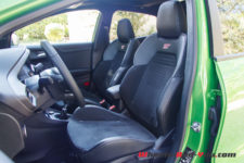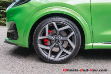 Les freins ne sont pas en reste avec une dimension plus généreuse (325mm à l’avant et 271mm à l’arrière). L’endurance est bonne sur route, resterait à voir sur circuit. La direction est ferme et précise avec un rapport de démultiplication de 11,4/1. Il s’agit d’une direction assistée électromécanique EPAS plus directe de 25% par rapport au reste de la gamme grâce à la combinaison d’une articulation avant spécifique, d’un bras de direction plus court et d’une crémaillère de direction plus rapide. Le tout offre une meilleure réactivité, surtout dans les virages. Mais cela occasionne toutefois des effets de mouvements pendulaires liés à l’arrivée du couple uniquement sur le train avant. Heureusement le différentiel mécanique à glissement limité (LSD) Quaife compense souvent.