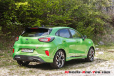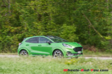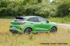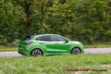 Quoique plutôt haute, la position de conduite est excellente. Cela permet de voir loin. La sélection des six rapports très bien étagés, via le petit levier de vitesse, est précise et je sens la fermeté de l’amortissement dès les premiers mètres. Les suspensions constituées d’amortisseurs bitubes ont un tarage ferme (plus ferme que sur la Fiesta ST) pour compenser la hauteur du SUV et pour éviter qu’il se penche dans chaque virage. Je vous rassure, le châssis est rigide au point même de lever facilement la roue arrière intérieur lors du passage de certaines épingles. Pour cela, l’effort de torsion de la suspension arrière a été augmenté de 50% par rapport à un Puma classique. Dotée d’une grosse barre antiroulis à l’avant et équipé de pneus Michelin Pilot Sport 4S spécifiquement développés pour ce Puma ST, la voiture colle littéralement à la route.