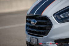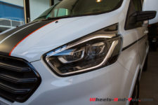 Oui, c’est imposant, mais passons. Les bandes racing sont assumées, tout comme les jantes de 18” et le kit carrosserie à l’ajustement peu soigné. Ce L1H1, pour châssis court et hauteur inférieur à 2m, développe un certain capital sympathie. Même s’il est massif, ses lignes s’arrondissent aux extrémités. La face avant, avec sa grille béante, peut prêter à sourire, mais la parenté Ford s’exprime ainsi.