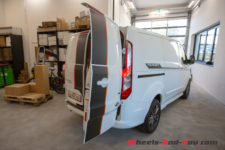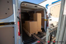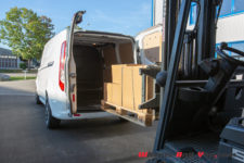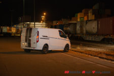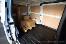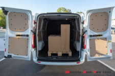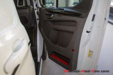 Toute la partie arrière est tôlée, aucune fenêtre vers la marchandise. C’est ici que prend place une jolie sérigraphie Transit. Pour les accès, les portes arrière s’ouvrent en battant, pratique pour charger une palette, mais le hayon a pour avantage d’offrir un abri de la pluie. Une porte latérale coulissante côté trottoir est de série, la seconde, côté conducteur, est en option. Et si je vous parle des portes, c’est parce que leur utilisation est marquante. Habitué à claquer de lourdes portes d’utilitaire, je trouve que celle-ci sont légères, se manipulent facilement et se ferment comme celle d’une Mondeo : tout en douceur.