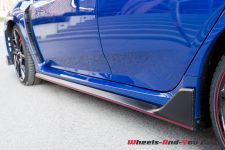 Je relève encore le traitement rouge et noir de l’intérieur qui accentue le côté sportif. C’est habituel chez les constructeurs japonais et je trouve que le rendu est très réussi. Néanmoins, ça ne s’harmonise que moyennement avec la teinte bleue de votre voiture d’essai. On peut se rassurer en mentionnant que c’est raccord avec les différents rappels de rouge présents sur les bas de caisse, les jantes et le badge Honda.