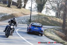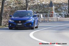 En courbe, cette Civic Type R vire à plat, la prise de roulis est quasi nulle mais surtout je ne ressens pas de comportement survireur à outrance. Pourtant, avec une telle puissance, ce n’était pas gagné d’avance. C’est grâce à une suspension avant à jambe de force avec double axe, mais aussi un châssis très affuté, qu’il est possible de contenir les effets de couple. Ces techniques sont déjà éprouvées, mais qui sont d’autant plus efficaces sur cette nouvelle Type R. Même sur un revêtement mouillé et sur des routes enneigées, le train avant conserve ses qualités. C’est une véritable réussite.
