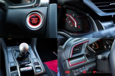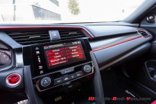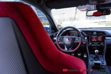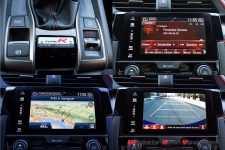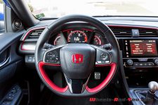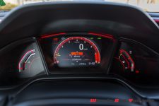 Point fort de l’habitacle de cette nouvelle Civic Type R : les deux baquets qui offrent un maintien parfait, de même qu’un excellent confort. Une fois correctement installé, je constate immédiatement que la finition a gagné en qualité. Il reste encore quelques plastiques disgracieux mais, au vu des tarifs pratiqués, on lui pardonne. La présentation est plus futuriste, un peu à l’image de la NSX, et l’ensemble des commandes tombent parfaitement dans les mains du pilote.