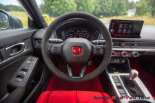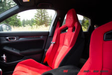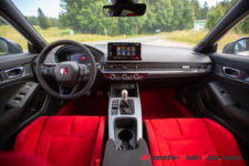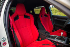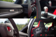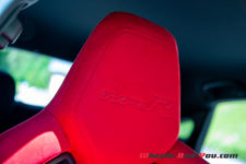 Une fois la porte conducteur ouverte, je ne peux que remarquer les magnifiques baquets revêtus de tissu rouge. Il s’agit d’une nouvelle matière, un imitation daim antidérapante. Le rendu est vraiment sympa. Comme de coutume sur les Type R, en combinaison avec le rouge des sièges avant, toute la moquette arbore la même teinte. Ambiance racing assurée ! Il n’y a que la banquette arrière qui est habillée de noir, toujours avec cette même nouvelle matière. C’est sûr que pour l’œil non averti, ça claque direct lorsqu’on le découvre, mais c’est typique des Type R et je trouve que ça correspond parfaitement à l’esprit de l’auto.