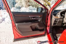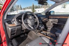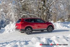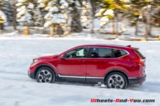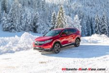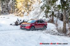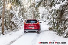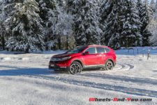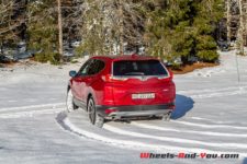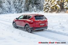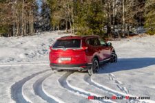 La grande surprise arrive lorsque je lance le SUV sur un parking désert au revêtement glissant, mélange de neiges tassées et glacées. Le « All-Wheel Drive » ici équipé est soutenu par la technologie « Real Time AWD with Intelligent Control System ». Pour le coup, le terme « Intelligent » n’est absolument pas volé. Avec de l’espace à foison pour permettre de tester les limites de traction et d’adhérence, je mets le CR-V sur la brèche… avec très grand mal ! Il m’est particulièrement difficile de le faire glisser et de le prendre en faute. Sans avoir à vraiment le « manager », le système de traction gère automatiquement et sans délai la répartition du couple sur chaque roue, ce qui a pour effet de remettre immédiatement en ligne le bébé de 1’705 kg. De quoi me donner pleinement confiance pour m’embarquer dans la poudreuse des sentiers zébrant les bois alentours. Là encore, le CR-V se montre exemplaire. Certes, ça glisse un peu, mais la machinerie fait tout le travail et me permet de profiter avec insouciance du somptueux paysage qui se présente à moi.
