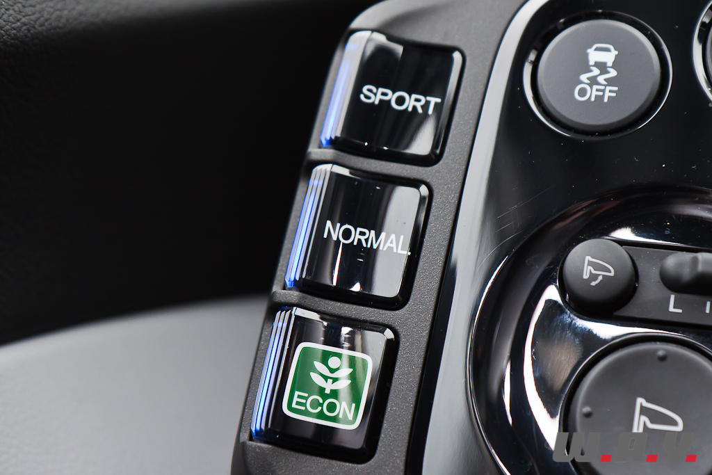 Dans un silence quasi total, la motorisation se met en fonction par une simple pression du bouton « Engine Start » rouge situé sur le tableau de bord. La petite nippone développe une puissance combinée de 124 cv avec un couple maximum très intéressant de 174 Nm, disponible entre 1’000 et 1’500 t/min. Un peu bruyant si vous le bousculez, il sait rester discret en conduite plus tranquille. Par défaut c’est le mode NORMAL qui est activé et le compteur s’éclaire de bleu. Comme vous l’imaginez, ce mode est le bon compromis pour une conduite de tous les jours, mais du moment que vous optez pour ce genre de motorisation, autant jouer le jeu jusqu’au bout et passez en mode ECON. Le compteur deviendra vert, et le restera, tant que vous saurez respecter la planète selon les règles définies par Honda.