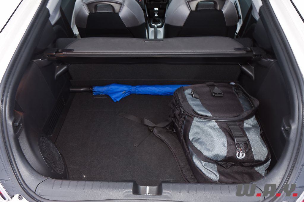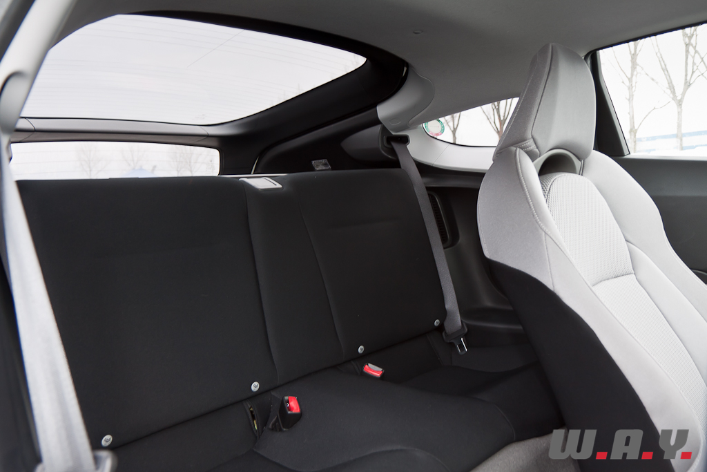 Le reste de l’habitacle est plus simple et basique. Beaucoup de plastiques aux textures différentes, durs pour certains, mais la finition correcte est en adéquation avec les standards de cette gamme de prix. Petite faute de goût tout de même avec les coloris différents pour les sièges avant et les sièges arrière. A ce sujet, autant je me suis senti à l’aise à l’avant, l’espace et le confort sont très bon pour le conducteur et son co-pilote, autant les places arrières, eh oui, c’est une 2+2, sont quasi inexistantes et serviront uniquement pour dépanner ou alors simplement pour accueillir vos affaires. Mais attention, il faudra y accéder depuis le siège passager car il est impossible de rabattre le siège conducteur, une ineptie à mon sens. En fait, le mieux est de baisser les sièges arrières et vous aurez ainsi un coupé deux places avec un immense coffre dont l’accès est excellent avec une ouverture généreuse du hayon mais un seuil de chargement relativement haut.