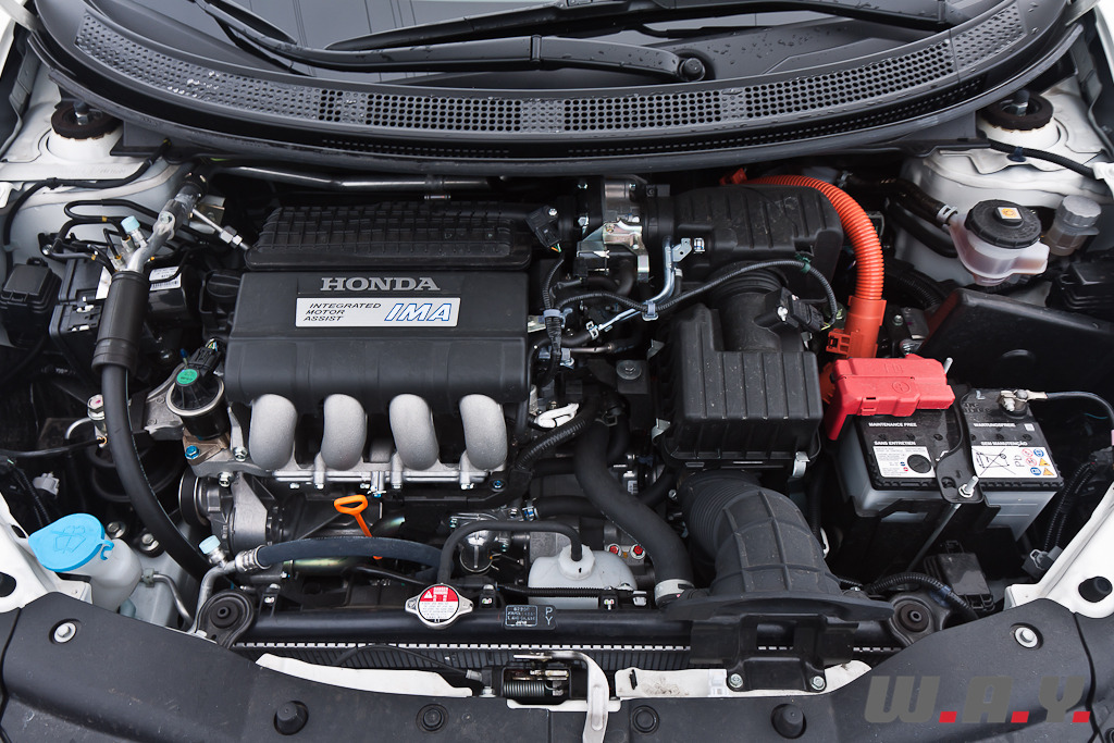 Regardons sous la jupe de cette CR-Z et voyons comment fonctionne cette motorisation hybride IMA. Commercialisé pour la première fois en 1999 sur l’Insight Mk1, le système appelé Integrated Motor Assist (IMA) est basé sur une double motorisation. Un moteur essence ultra sobre et un moteur électrique d’appoint, monté sur le même axe, qui a pour but d’assister le moteur thermique. Au démarrage et lors d’accélérations, la puissance du moteur électrique s’additionne à celle du moteur essence afin de fournir plus de performance sans pour autant avoir besoin de plus d’essence. En cas de freinage ou décélération, le moteur électrique permet aussi de recharger la batterie, logée sous le plancher du coffre, en récupérant l’énergie cinétique.
