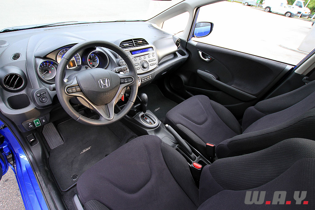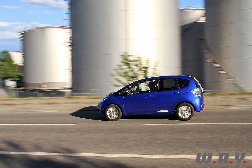 C’est là que se trouve la partie réellement intéressante de l’auto. Le i-VTEC 1.3i de 88 CV et 121 Nm est assisté par un moteur électrique de 14 CV (à 1’500 t/min) et 78 Nm (à 1’000 t/min). Honda a choisi d’innover en insérant un petit moteur électrique entre le moteur thermique et la boite de vitesses CVT. L’avantage est que la voiture ne prend qu’une cinquantaine de kilos d’embonpoint. Les batteries, elles, trouvent leur place dans le coffre, sous le plancher. Ce qui contraint à l’adoption d’un kit anti-crevaison en lieu et place de la bonne vieille galette, un moindre mal. Le moteur permet de rouler en full électrique, fonction dont la CR-Z que nous avions essayée ne disposait pas. Pour activer ce mode, il convient de remplir quelques conditions assez difficiles à atteindre : il faut rouler à vitesse stabilisée en dessous de 50 km/h, le moteur thermique ferme alors les cylindres pour stopper la combustion. Le passage d’un mode à l’autre est presque imperceptible et ne peut pas fonctionner sur plus de deux kilomètres. A mon sens, cela n’apporte pas grand-chose. Je commence à me demander si la motorisation hybride, dans cette Jazz, n’est pas plus un argument de vente qu’un réel atout. Je ne reste pas sur cette impression et tourne la clé de la citadine.