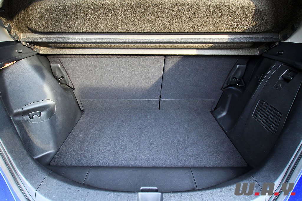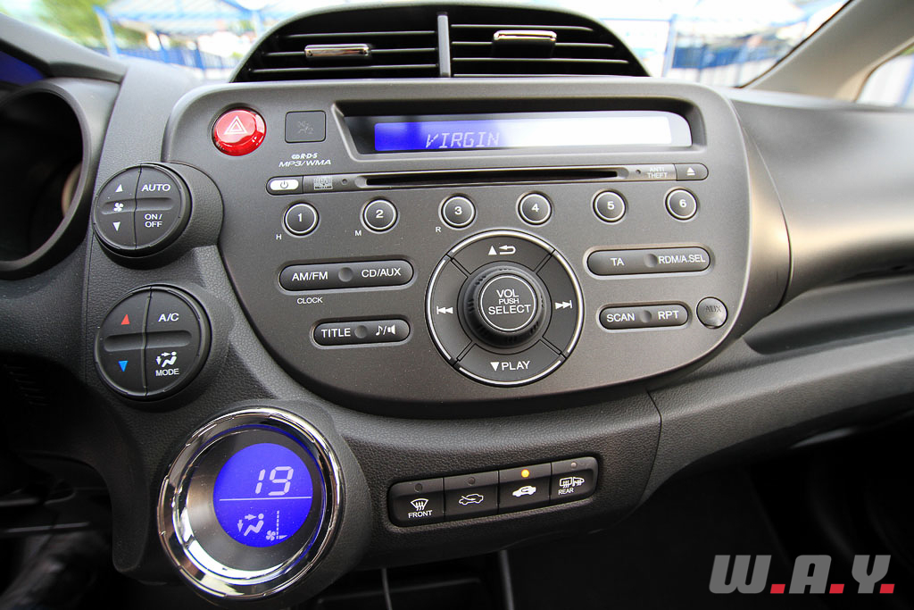 J’ouvre la porte et découvre l’intérieur. Il fait plutôt bonne impression : la finition est au rendez-vous, mise à part quelques plastiques un peu “cheap” ça et là, le design est agréable et les commandes tombent bien sous la main. L’habitacle est très lumineux grâce au large toit vitré panoramique, on se sent tout de suite à l’aise. Le design fait preuve de recherche afin de se différencier un peu de la concurrence, la console centrale est orientée vers le conducteur afin qu’il n’ait pas besoin de trop perdre de sa concentration pour utiliser la climatisation ou l’autoradio. Autre point positif, il y a beaucoup de rangements idéalement disposés. Mais si leur nombre est élevé, leur volume, lui, pourrait-être plus conséquent. Étant quelqu’un de mobile, emportant souvent mon bureau avec moi, j’ai regretté de ne pouvoir cacher mes affaires de la vue de tous, dommage. Le volant à trois branches est équipé de commandes au volant pour la radio, le téléphone (option que nous n’avions pas) et le tempomat. Les sièges sont confortables et leur maintient est correct. L’autoradio est simple à utiliser, et la qualité de son est bonne. Globalement, il est agréable de vivre à bord de la Jazz. Le GPS est disponible en accessoire. Vous pourrez choisir entre un système de navigation semi intégré fonctionnant avec un SSD ou un modèle portable de chez Garmin, si vous n’en avez pas déjà un. L’équipement fait fi du superflu, mais l’essentiel est là. Le rétro-éclairage de la planche de bord s’illumine d’un beau bleu, qui passe au vert lorsqu’on conduit le pied léger, histoire de récompenser visuellement nos efforts. Cela permet de se réguler sans même y penser. Les places arrière accueilleront aisément deux adultes, la place aux genoux est correcte et la hauteur sous toit très appréciable. Cette Jazz reprend les « Magic seats » qui offrent une modularité exceptionnelle aux places arrière avec la possibilité de rabattre les sièges vers le bas afin d’offrir un coffre à fond plat de 1’320 l. (303 l. coffre seul), ou alors vers le haut pour pouvoir glisser par exemple un vélo à la place de l’assise. Au final, le coffre de cette version ne cède que 76 l. à la version essence 1.2 et 96 l. à la 1.4. L’espace intérieur n’est donc que peu grévé par les batteries du système hybride et c’est une bonne nouvelle !
