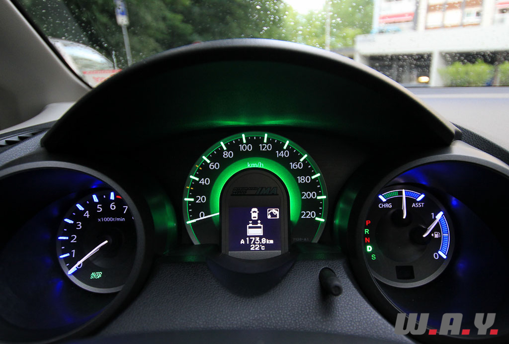 Je démarre, et même si je le savais à la lecture de la fiche technique, je suis déçu d’entendre le moteur thermique. La boîte de vitesse calée sur D, je m’élance dans la circulation. La voiture affiche clairement ses préférences : la ville est son domaine de prédilection. Le démarrage au feu rouge se fait vigoureusement, grâce à l’assistance électrique, puis, le moteur s’essouffle vite. Je découvre rapidement le bouton vert « Econ ». Son but : optimiser la gestion moteur pour diminuer la consommation de carburant (diminue le couple de 4 %), optimiser la loi de changements de rapports de boîte, augmenter la récupération d’énergie au freinage et changement de fonctionnement de la climatisation (mode recyclage plus fréquent, coupure complète lorsqu’on est à l’arrêt). Je me prends rapidement au jeu de l’éco-conduite grâce au changement de couleur du tableau de bord et les pictogrammes qui m’indiquent si je suis un bon éco-conducteur. Au final, à ce jeu, j’arrive à descendre à 5,4 l./100km de moyenne sur une utilisation uniquement citadine. Honda prétend qu’il est possible d’arriver à 4,5 l./100km. Par contre, lorsque l’on sort de son terrain fétiche, la consommation remonte drastiquement : plus de 6 l./100km en extra-urbain et 7 l./100km sur autoroute. Le tableau s’assombrit d’autant plus que dans ces conditions, la voiture est vraiment molle à l’accélération et très bruyante, non seulement le moteur qui hurle à plein régime dès que l’on veut légèrement accélérer, mais également les bruits aérodynamiques qui deviennent gênants. C’est vraiment LE point noir de l’auto. Je n’ai pas du tout aimé la rouler hors de la ville; dans le genre une VW Polo ou une Citroën C3 seront bien plus agréables, et ne consommeront pas forcément plus. Mais qu’importe, ce n’est pas là sa vocation de toutes les manières, même si on imagine aisément partir une semaine en vacances tant elle regorge d’espace pour les passagers et les bagages. Le châssis ne souffre d’aucun défaut notable, l’amortissement est bien géré, ce qui rend la voiture confortable. Elle sait rester confortable en ville, mais également lorsqu’on augmente le rythme, sans pour autant perdre trop de sa capacité à faire communiquer le train avant. Avec sa hauteur, l’auto tend à prendre du roulis, mais encore une fois, cela invite à conduire avec anticipation, ce qui colle bien à l’esprit. La boîte a tendance à ne pas vouloir passer au rapport supérieur, mais elle fait plutôt bien son office compte tenu du manque de vigueur du moteur. Le freinage, lui, est sans reproche, efficace et progressif et la maniabilité en ville est très bonne tant la visibilité est excellente et la direction bien démultipliée. Il est aisé et agréable de se mouvoir dans la circulation et ces atouts mettent en confiance pour se garer aussi facilement qu’avec des modèles plus compacts.