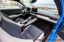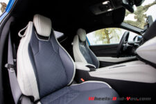 A bord de la Honda Prelude, l’ambiance joue sur un contraste marqué entre sportivité et recherche de valorisation. Notre véhicule d’essai propose une combinaison de teintes blanc et bleu nuit, avec une sellerie micro-aérée rehaussée par des surpiqûres bicolores. Les contreportes et la planche de bord reprennent ce traitement, mêlant cuir lisse ou tanné, dans une volonté de monter en gamme.