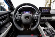 La chute de pavillon, très étirée, guide naturellement le regard vers une poupe épurée. A l’arrière, une signature lumineuse en bandeau intègre feux et logo Honda dans un ensemble très contemporain. Le bouclier, plus simple, adopte un diffuseur discret alors qu’un léger effet de spoiler intégré au hayon suggère l’appui.