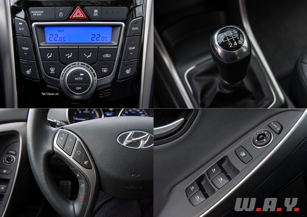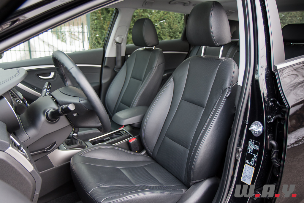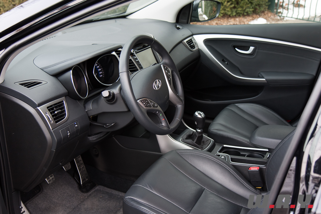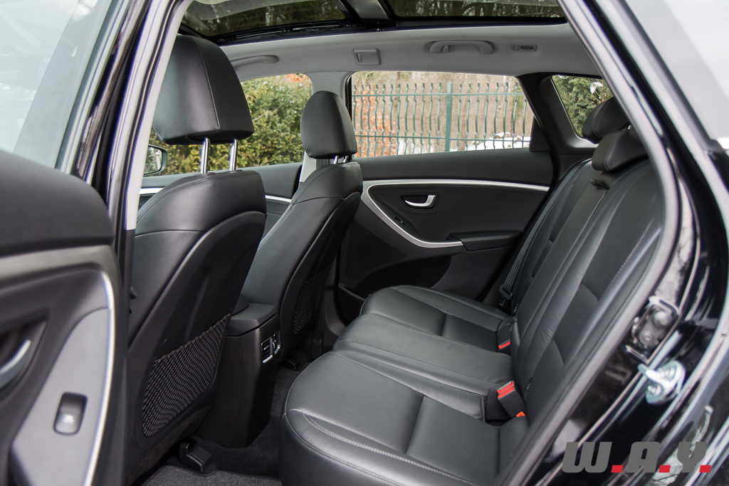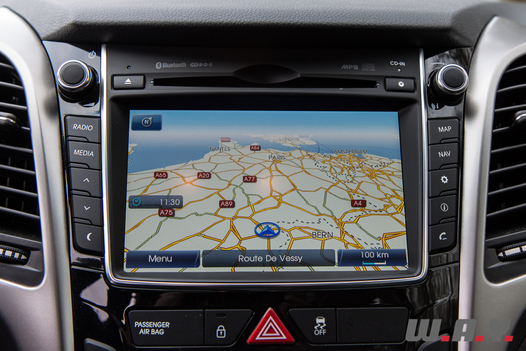 Tout d’abord un intérieur cuir de très bonne qualité qui recouvre les sièges dont l’assise est confortable. Puis toute l’armada du moment comme par exemple un système de navigation avec large écran couleur, une connexion Bluetooth pour le téléphone, une caméra de recul, un toit panoramique coulissant en verre, un système Smart Key pour ouvrir/fermer/démarrer la voiture tout en gardant la clé dans sa poche, un ordinateur de bord ultra complet, une climatisation automatique bizone, un régulateur de vitesse, un volant multi-fonction, etc. Franchement, il y a tout dans cette Hyundai, surtout avec ce niveau de finition. Bien sûr, il y a quelques plastiques durs, deux ou trois petits détails de finition approximative et quelques éléments bon marché, mais quand on sait que notre i30 Wagon affiche un prix total tout juste supérieur à CHF 35’000.-, je n’ai rien à redire, sauf peut-être « Bravo Hyundai » !