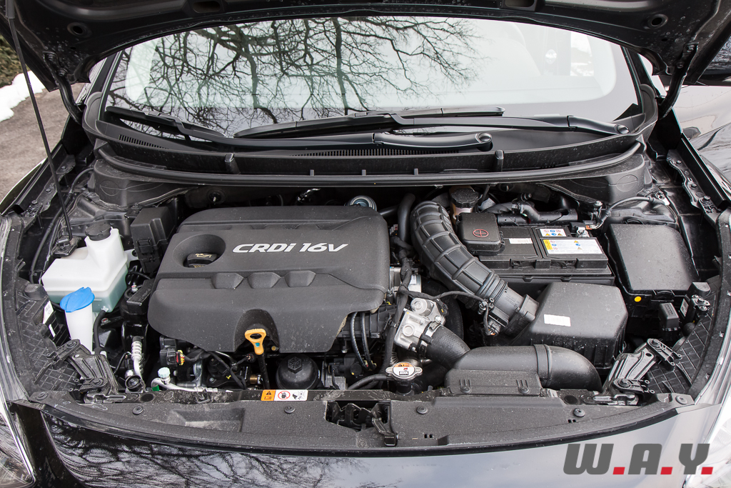 Pour notre essai nous avons hérité de la seule motorisation diesel, un quatre cylindres 1.6 CRDi turbocompressé qui développe 128 CV pour un couple de 260 Nm, le tout couplé à une boîte manuelle six rapports. Certes, pour les aficionados de la conduite sportive, ça sera un peu limite, mais pour Monsieur ou Madame tout le monde qui cherche une voiture ramenée à sa principale fonction, soit se déplacer, il y a bien assez de ressources. Je reprocherais quand même à ce bloc d’être un peu bruyant, surtout à froid, mais il faut reconnaître que c’est souvent le cas sur les petits poêles à mazout. Deux moteurs essence complètent le choix de la mécanique, un 1.4 l. de 100 CV, seulement disponible avec la finition entrée de gamme « Comfort », puis un 1.6 GDi de 135 CV issue de la famille Gamma, identique à celui qui équipait la Kia Cee’d récemment essayée. Un ensemble de motorisations modernes, répondant aux normes Euro 5 et affichant des valeurs de consommation et d’émissions de CO2 particulièrement en phase avec le respect de l’environnement.