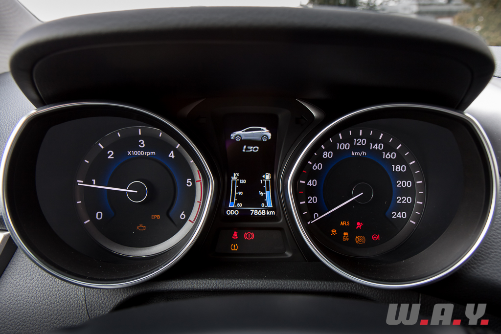 Si la conduite est un élément primordial d’une voiture à vocation plaisir avant tout, c’est un point qu’il ne faut toutefois pas négliger sur une auto plus conventionnelle. Et là, encore une fois, la coréenne étonne en bien. Douce et agréable à conduire, cette i30 Wagon vous emmènera partout dans un confort très agréable. Comme mentionné, la motorisation diesel est un peu bruyante au démarrage, mais une fois lancé sur l’autoroute, elle se fera vite oubliée. En ville c’est pareil, la i30 se faufile avec aisance, facilitée par le système de direction « Flex Steer ». Ce dernier, de série sur les finitions Style et Premium, agit sur la consistance de la direction et propose trois modes de conduite : Confort, Normal et Sport. Certes très pratique lors de manœuvres, j’ai trouvé pour ma part que les deux premiers réglages manquaient cruellement de ressenti pour le conducteur. Un point d’ailleurs que mon collègue avait déjà relevé lors de son essai de la Kia Cee’d équipée d’un système similaire. D’ailleurs, j’ai parcouru la quasi totalité de mon essai en laissant la direction en mode Sport, avec quand même un arrière-goût de trop assisté et pas assez communicateur.