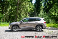 La transformation des flancs se fait dans les canons actuels de design automobile, en procédant à un soulignement à plat des arches de roues, en cintrant la partie inférieure des portes et en soulignant nettement la ligne haute de ceinture. Comme son prédécesseur, le Santa Fe nouveau cru s’habille de plastique noir sur l’ensemble de son bas de carrosserie, tout comme aux passages de roues.