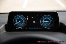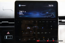 Face au conducteur, le tableau de bord est constitué d’un écran aussi, avec la même présentation que dans la Ioniq 5. Avec cette dernière mais aussi la i30 N, j’ai gardé un bon souvenir de leurs volants respectifs. Là, on semble avoir fait un voyage dans le passé avec un plastique argenté digne de voitures japonaises de 2010. L’utilisation des boutons n’est pas parfaitement claire, comme le bouton mode qui change de source de l’autoradio, et le bouton mode de la planche centrale alterne entre éco, confort et sport. Quant aux palettes derrière le volant, à la rigueur pour forcer un rétrogradage en descente, mais autrement on se demande pourquoi elles sont là.