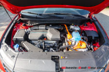 Pour revenir au modèle qui nous intéresse aujourd’hui, la grande nouveauté de la gamme, le système se compose d’un moteur thermique et d’un moteur électrique disposé sur l’essieu arrière. Hyundai intègre à ce système une batterie lithium polymère qui diffère des batteries lithium-ion traditionnelles, puisqu’il s’agit ici de batterie gel et non solide. D’une capacité totale de 1,47 kWh, elle permet, selon les données constructeur, de parcourir 62 km en mode électrique. A titre personnel, en adoptant une conduite très souple et en anticipant au maximum le trafic, je parviens à plusieurs reprises à dépasser la marque des 75 km en une charge.