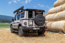 Sur les flancs, c’est un festival de fonctionnalités : rails métalliques, points d’ancrage, inserts prêts à recevoir coffres, outils, bidons ou même une roue supplémentaire. En le longeant, on imagine presque les sangles tendues et le matériel fixé pour un départ vers le désert ou la forêt. Les détails ne sont pas oubliés : le nom « Grenadier » embouti sur le capot, des plaquettes signalant son origine, autant de petites touches qui cultivent son identité de baroudeur né.