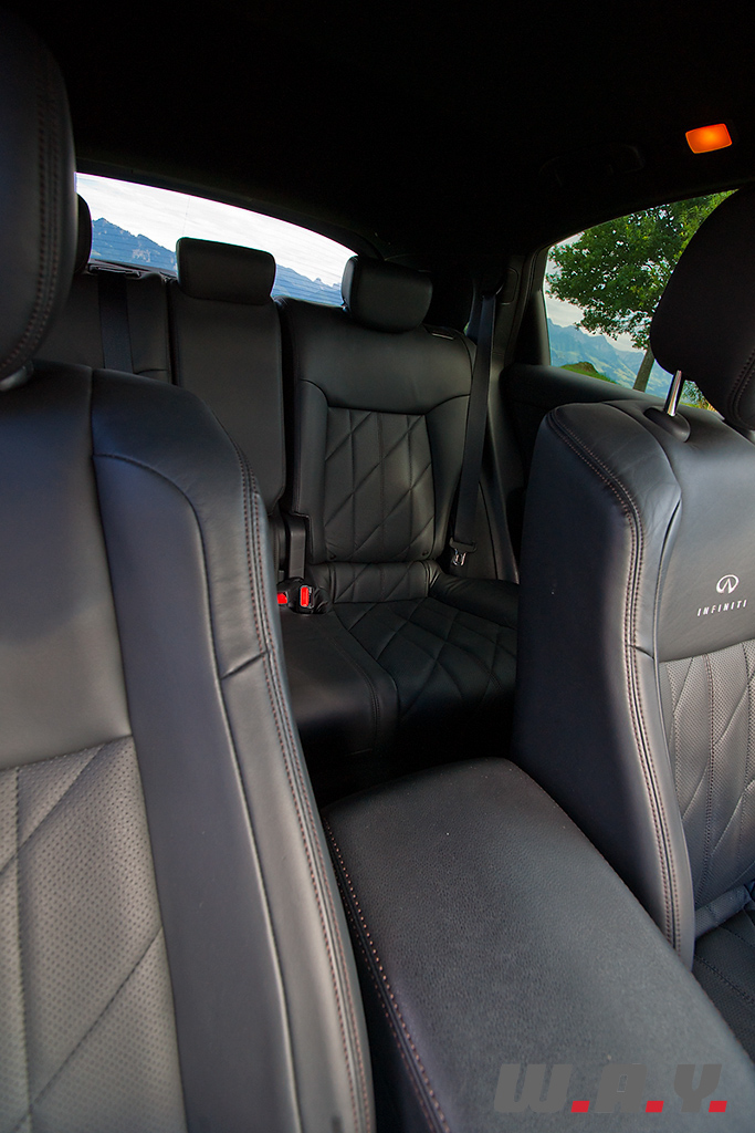 Dans l’ensemble, la finition m’a paru de bonne qualité. On sent bien là la volonté d’Infiniti de se positionner dans le haut de gamme. Sur le plan de la sécurité passive, 6 airbags sont disposés à l’avant et à l’arrière pour protéger les occupants.