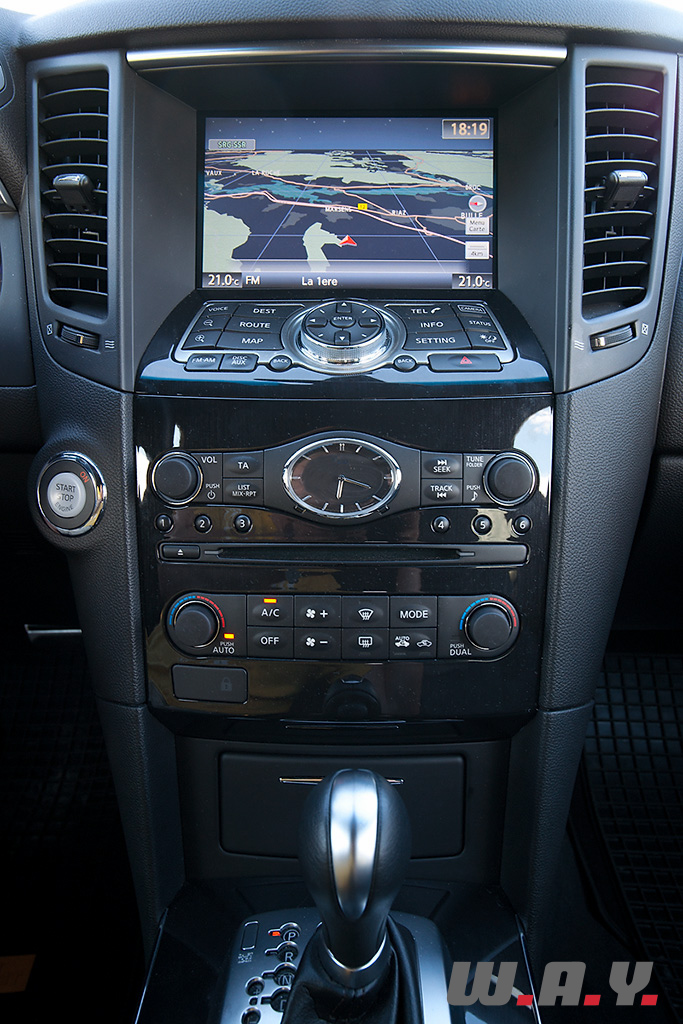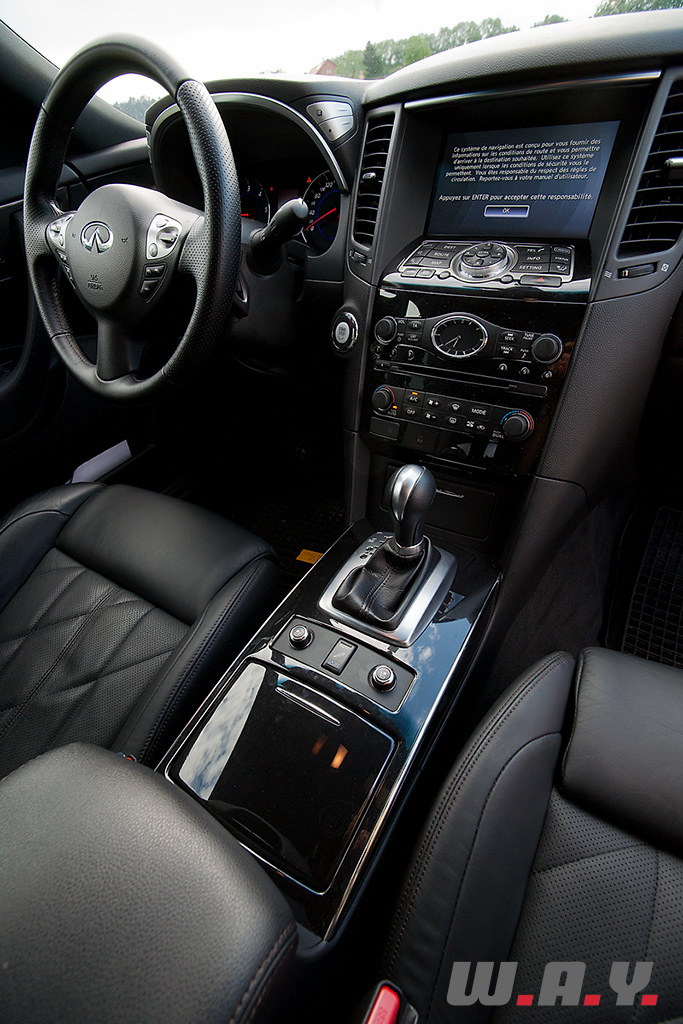 Le grand écran GPS offre plusieurs affichages : 2D, 3D, combiné… Son usage est assez simple et intuitif mais le graphisme est dépassé par les derniers développements en la matière. L’ergonomie de la plupart des commandes est bonne. Le levier de commande de la boîte est classique pour une boîte automatique à convertisseur, avec un mode séquentiel. Personnellement, je ne comprends toujours pas les fabricants qui inversent la commande séquentielle classique où l’on tire pour mettre le rapport supérieur et l’on pousse pour rétrograder. Sur le FX, c’est l’inverse… Heureusement, on peut également commander la boîte à l’aide des palettes disposées de part et d’autre du volant. Sur le plan acoustique et à part les quelques minutes qui suivent un démarrage à froid, les bruits du groupe diesel sont plutôt bien filtrés et l’ambiance est assez veloutée, V6 oblige.