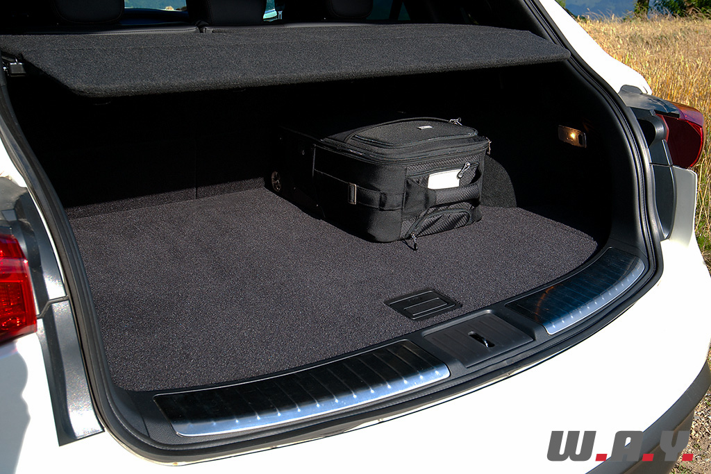 Le hayon donne accès à un coffre dont le volume est plus petit que ceux de bon nombre de 4×4 de même gabarit. Avec 410 litres, il permettra tout de même à quatre adultes de partir en week-end mais ne constitue pas une référence en la matière. En baissant les sièges arrière, le volume monte à 1’305 litres. La faute au pavillon de toit plongeant qui en réduit sensiblement la hauteur. De série, un filet rangé sous le plancher du coffre permet de séparer l’habitacle du coffre. Au même endroit, on trouve un kit de réparation en cas de crevaison, avec un compresseur électrique, une solution liquide anti-crevaison et quelques outils sommaires, ainsi que l’amplificateur du système acoustique Bose.